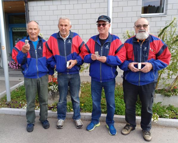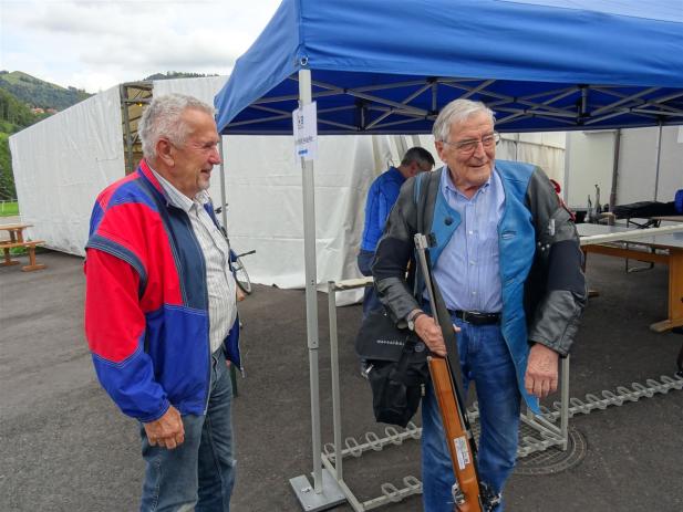 Abgemacht war, dass Oskar am Sonntagmorgen schiessen und dann am Nachmittag am Absenden allfällige Preise abholen würde. Er schoss sackstark, neun Zehner und einen Neuner pfefferte er in die Scheibe – Total 99 Punkte. Für das Gruppenresultat zählten die drei besten Einzelresultate. Das ergab für uns 280 Punkte und den Gruppensieg in der Kategorie „Ausserkantonale“. Damit feierte Oskar Kolb zwei Siege in zwei Tagen. Bereits am Vortag, am Veteranen-GM-Final in Sargans, war er zusammen mit seinen Kollegen erfolgreich. In der Kategorie „Bester Sportschütze Kat. A“ wurde Oskar in Fischenthal knapp Zweiter, Punktgleich hinter dem Sieger Martin Derrer aus Uster, der schoss eine bessere Mouche.