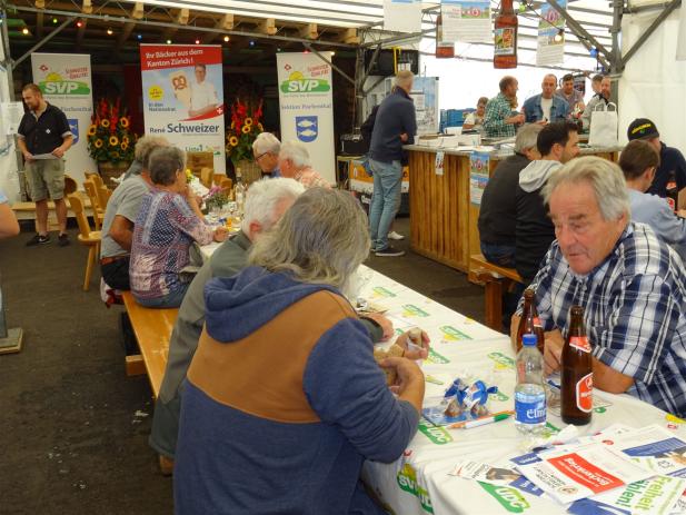 Mitten im Wahlkampf, einen Monat vor den Eidg. Wahlen, für uns ein besonderes Erlebnis, was da nebst dem Schiessbetrieb, im Festzelt und amAbsenden so ablief. Sich mal mit Politikern, welche man bisher nur aus denMedien kannte, persönlich auszutauschen, war für uns interessant, unterhaltsam und amüsant. Das 40. SVP-Schiessen war so ein richtig traditionelles Schützenfest mit 454 Schützen, Absenden und Siegerehrungen.