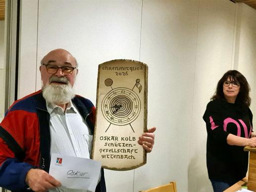 Oskar Kolb, langjähriges Mitglied der Schützengesellschaft wurde für seine grossen Verdienste für die Schützengesellschaft zum Ehrenmitglied ernannt,